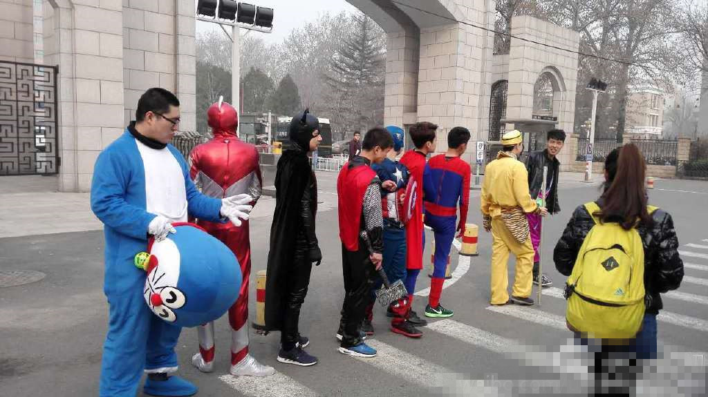 千龙网综合报道 据网友爆料,3月17日下午,9名男生手举“反校园暴力横幅”在北京语言大学门口扮演起孙悟空、奥特曼、美国队长、雷神等中外动漫人物形象,网友笑言:“你们往那一站,谁还敢校暴啊,你们绝对是强悍的”。