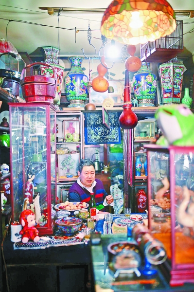 2003年,下海后的孟东明经营的小饭馆停业了,他逐渐成为了一名专业的收藏家。最初在城南旧货市场开设小店,2008年离开那里,来到了廊房二条。他说那天下午他在小胡同里寻摸门脸,遇上了房东,俩人一聊,相见恨晚。于是,他将自己的小店搬到了这里。随着廊房二条改造的进程,他的小店与旁边的正阳书局,还有不远处的“爆肚冯”,算是廊房二条难得保留的京味儿店铺。