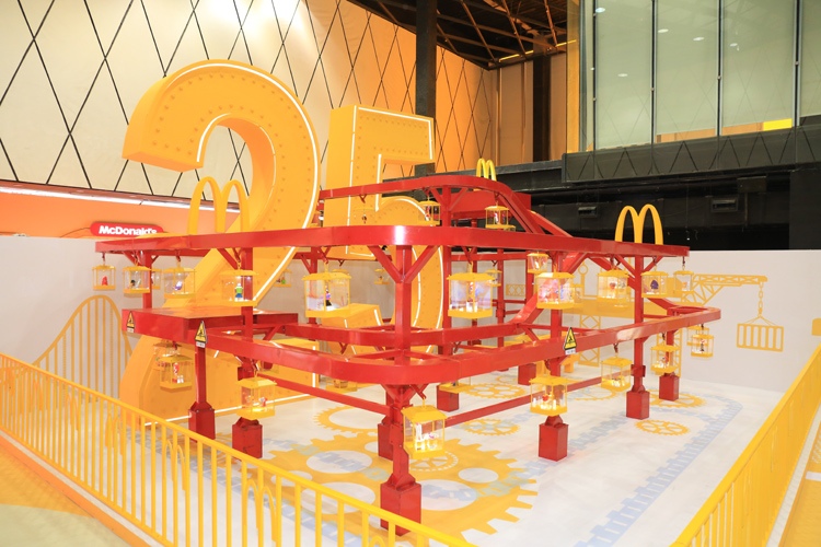 展览以“制造快乐的玩具工厂”为设计理念,运用吊塔、输送带、仪表板等工厂元素贯穿始终,展馆分为动画全明星区、热门卡通区、Hello Kitty和朋友区、麦当劳叔叔和朋友区、动物世界区和其它经典区。现场亮点众多:超过2米高的Hello Kitty吊塔、开心乐园餐盒形状的波波池、25周年大型玩具过山车以及1990年中国大陆版的“食物变形金刚”,这也是一套与麦当劳中国同龄的珍贵古董玩具。