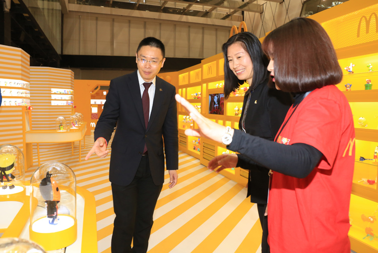 北京麦当劳食品有限公司总经理张帆先生(左一)与副总经理周炜女士(中间)参观“奇趣玩具厂”。