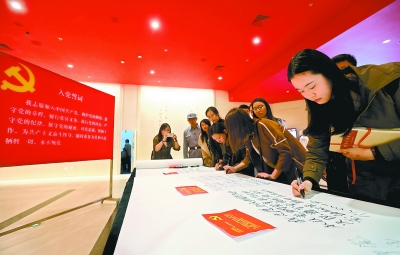 一位首都大学生正在誊抄“新中国成立初期中国共产党入党誓词”。他说:“当用白纸黑字写出‘我志愿加入中国共产党’的时候,突然又觉得心潮澎湃。这是一种仪式,更是一种警示,提醒我要对党忠诚,积极工作,为共产主义奋斗终身。”