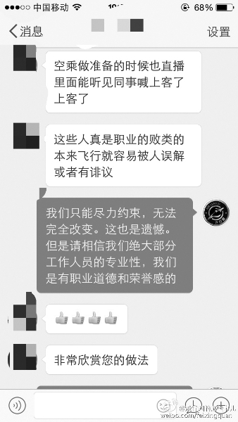 “这类事情确实在极小范围内存在,并非单一事件。”博主“飞行圈的那些事儿”表示,希望通过微博平台曝光,能起到“敲山震虎”的警醒作用,“之前国航直播事件发生之后,航空公司很快便做出处置并且发布了通告,可以看出民航业对此还是很重视的。”
