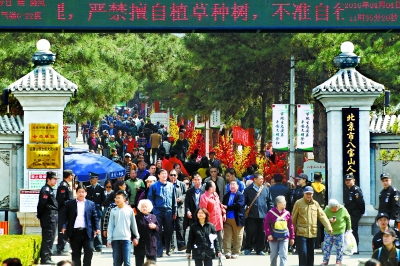 今天(4月4日)是清明节,三天的小长假有效缓解了前往各个陵园祭扫的人流。上午11时,前来八宝山人民公墓扫墓的市民明显减少。 记者 程功摄