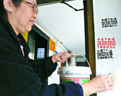 清理小广告需要足够的耐心,邻居装修房子后会把剩余的涂料送给班阿姨。