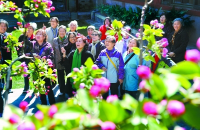 这个春天,没有老伴陪伴的班阿姨和社区一起组织老年人观赏宋庆龄故居的海棠花。