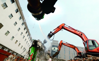 5日上午,施工人员在红桥天乐市场拆除现场喷水除尘 摄/记者 杨益