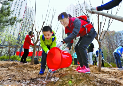 4月5日,安贞街道居民和青年志愿者一起在家门口的社区“小微公园”参与植树、养绿公益活动,美化环境从身边做起。