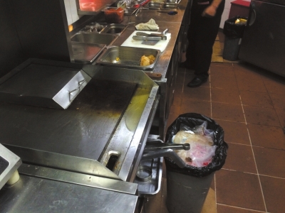3 月30日中午,一名员工用铁板烧煎完鸡肉后,看到旁边垃圾桶里的垃圾快冒出来时,他随身用铁板烧刮铲,直接把垃圾捅下去,随后将刮铲重新放回铁板烧操作 台。记者注意到,类似这种情况,该店员工都是如此操作,即便是捅完垃圾后,刮铲上沾满了灰尘,都不会进行任何清洗。