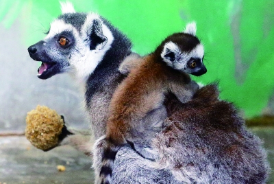 ▲环尾狐猴宝宝“依偎”在妈妈的背上