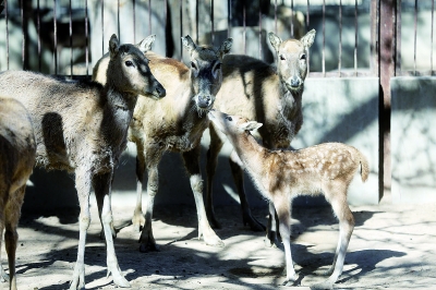 在羚牛馆斜对过的国家一级保护动物麋鹿家里,两只新出生的小麋鹿正颤巍巍地跟着妈妈学走路。