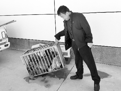 工作人员将捕捉到的狐狸放进笼中,准备送往野生动物救护中心