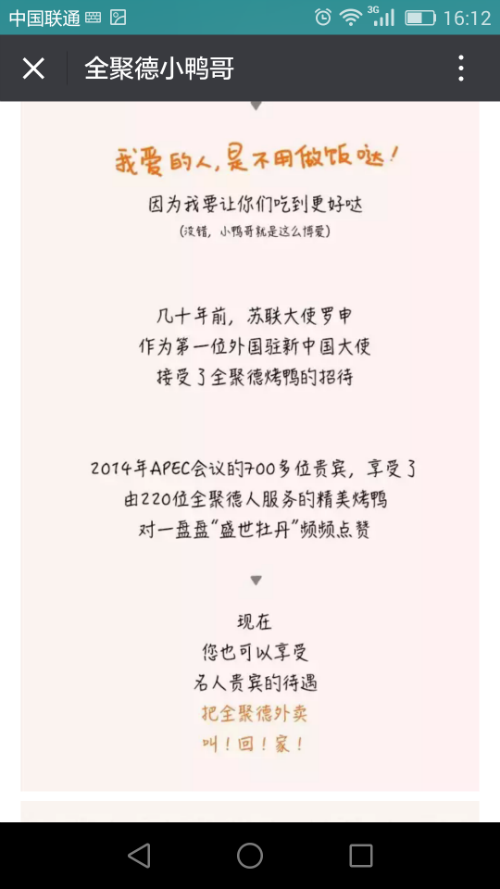 千龙网北京4月12日讯 手作鸭卷、芥末鸭掌等全聚德的招牌菜也能直接点外卖了!4月12日,百年老字号全聚德公众号正式上线,不管您是在家还是在外面,想吃全聚德分分钟搞定。