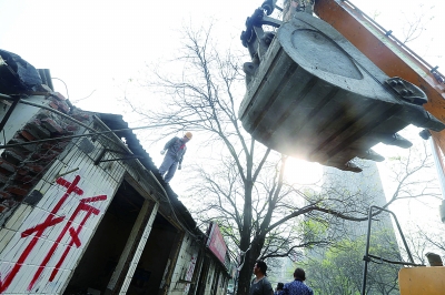 今天上午9时许,包括街道办事处、城管、食药监、工商等诸多部门在内的200多名执法人员已经在太平桥西路的街道两侧准备就绪。随着一间间15平方米的门脸房在挖掘机轰隆的作业声中倒塌,一旁的洒水车连忙跟进直喷,将墙壁倒塌时扬起的尘埃冲回地上。