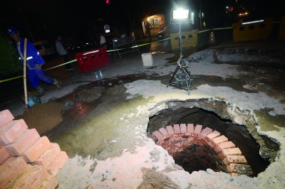 昨晚8时许,记者赶到事发现场时看到,为了排查塌陷原因,在塌陷的坑洞旁边,抢修人员又开掘了一个面积5平米左右的深坑。沙石、水泥以及挖掘机等救援车辆静置一旁。