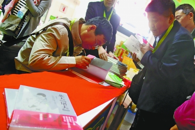 上午9点半,在位于老国展4号馆的展台前,拿着书等待签名的观众已经排起了近20米的长队。正在签名的陆步轩穿一件浅色夹克衫,还斜挎着背包,“今天早上刚从西安坐火车到北京,直接过来签名了,没想这么多人。”他说。在签名的间隙,不时有观众要求和陆步轩合影,他都一一满足。“我觉得卖猪肉不丢脸,代表了一种不向世俗低头的精神。”等待签名的徐先生对记者说,会把这本书带回去送给自己的儿子。