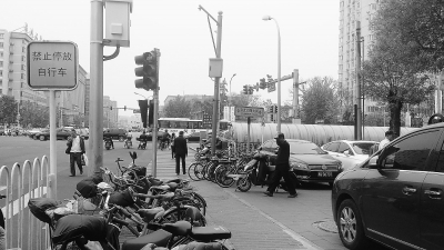 在便道旁边立着一块指示牌,上面写着“这里禁止停放自行车”,禁停牌下仍然停着五十多辆自行车。南侧便道上,停放着的自行车数量更是惊人。这条六七百米长的人行横道上,被密密麻麻的自行车停满,行人无处下脚。
