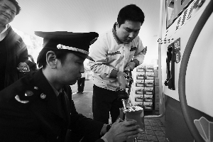 在位于北京科技大学北门的中石油加油站,两名工商检测人员在加油站工作人员的协助下,从加油枪里将汽油抽进一只银色的方形油桶内。“每个桶一升汽油,同一个加油枪要抽两桶。”抽检人员表示,第二季度抽检的样品主要是汽油,因此在该站92号和95号各抽两桶。