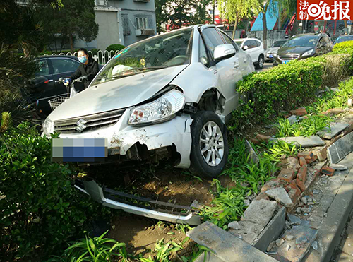 上午9时记者在现场看到,铃木轿车车体趴在了绿化带上,车头损毁严重,车内两个气囊全部打开。记者注意到,事发西向东的主路上,有一条明显的刹车痕迹。由于撞击力大,把绿化带上10厘米的水泥台全部被撞坏。