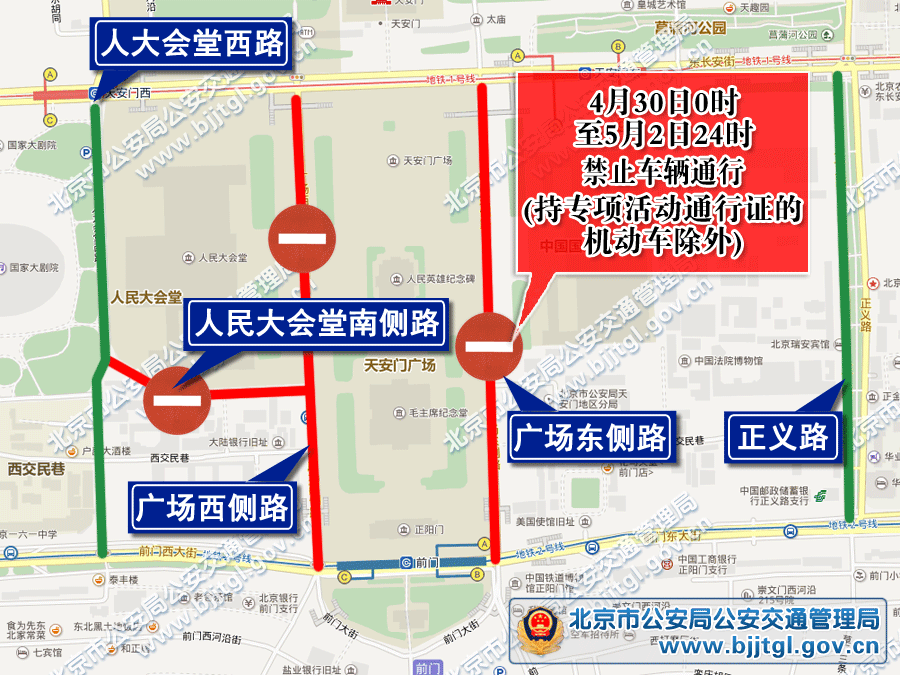 4月30日0时至5月2日24时,广场东侧路、广场西侧路、人大会堂西路(人民大会堂南侧路段)禁止车辆通行(持专项活动通行证的机动车除外)。