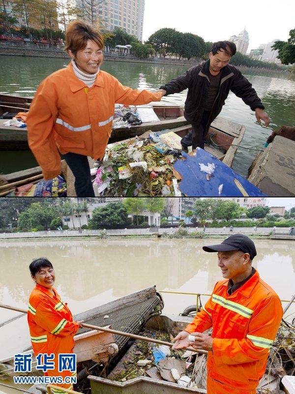 拼版照片,上图:2008年3月12日,杨兰芳(右)、罗祥英夫妇走过盛满垃圾的环卫小船。下图:2016年4月25日,暴雨让福州晋安河内垃圾增多,手指受伤的杨兰芳(右)仍然坚持陪伴在妻子罗祥英身旁,清理内河垃圾。新华社记者 姜克红 摄