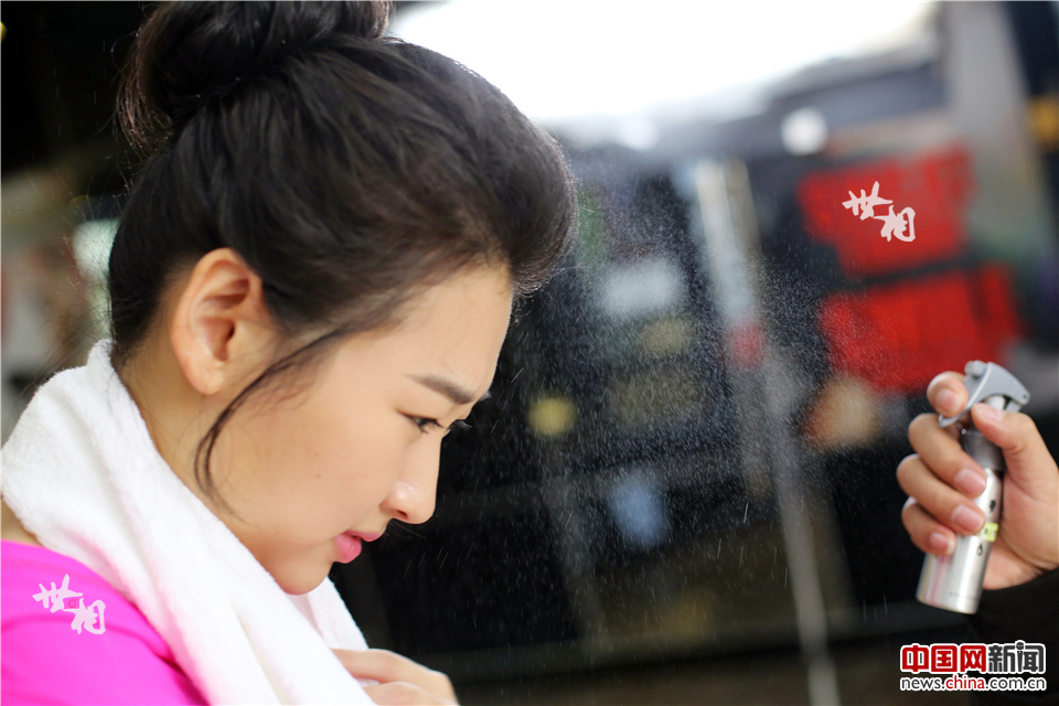 为了制造健身出汗的效果,化妆师往高雪儿额头喷水。一个场景拍了5、6次,化妆师不断给她补妆和喷水,高雪儿有点小情绪。