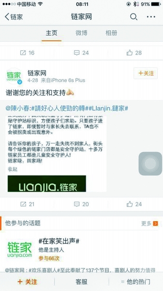 而北京链家一位工作人员在接受媒体采访时称,链家将成为“失联儿童守护站”一事,消息一开始是从内部员工动员会上流传出来的,本来是准备一切就绪再发布。