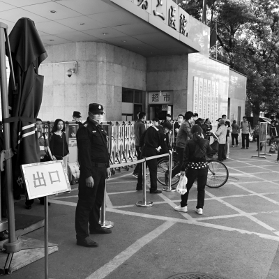 记者在现场看到,医院大门紧闭,门前已经拉起了红线,多名保安在大门前维持秩序。有位50多岁的女士带着一个小女孩准备进入医院探望患者,保安告诉她们,必须让住在医院内的患者来接或者他们收到通知,才可以让她们进入院内。
