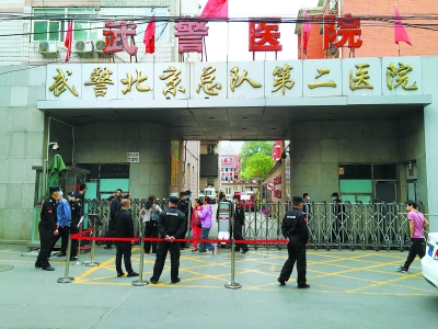 今天(5日)早上,武警二院大门紧闭,门前站着10多名保安,在警戒线内维持秩序。大门南侧原来的一片空地常有过路群众驻足围观,今天这里也围起了警戒线。于是围观者涌向了武警二院正门对面的便道上。武警二院正门对面是一排商铺,其中有一家殡葬用品店和一家面馆,老板或许是觉得围观群众挡了他们的生意,也效仿武警二院在店的橱窗前拉起了“警戒线”。