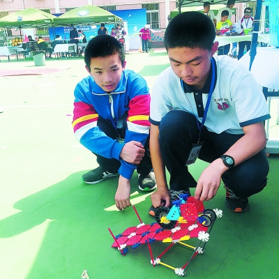 操场一侧,孩子们正在进行“动力小车”项目的比拼,利用规定数量的创意构建教具零件,搭建斜坡和小车。用时长短、小车稳定性、跑得远近是评比的标准,而利用有限的零件调整出最合理的结构是比赛的关键。五中分校两名初二男生的小车已经进入调试阶段,“我们‘几易其稿’,最开始想制作一个四轮车,后来发现,当车头比车尾重时跑得更远。于是我们将前面的小轮,换成了大轮,效果果然好多了!”制作小车剩下的零件全部用来搭建斜坡,“斜坡高度越高,小车跑得越远。”来自首师大的指导老师解释,这个项目使用了创意结构设计、重力势能与动能转化、角度计算等物理和数学知识点,“当孩子们在课上学到这些知识时,回忆起今天的情景,会有更真切的理解。”