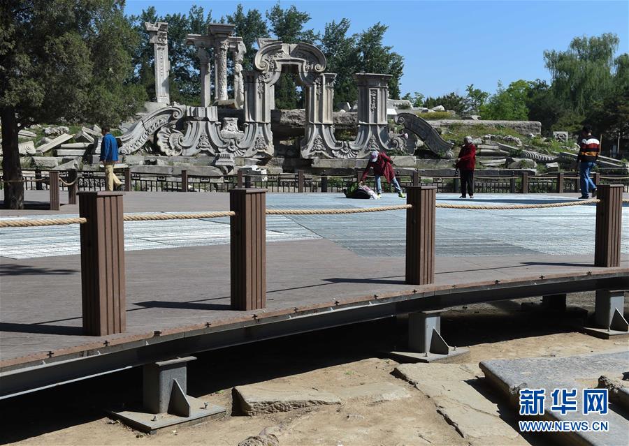 5月10日,游客在已铺设完成木栈道的圆明园西洋楼遗址参观。当日,圆明园西洋楼遗址木栈道铺设完成。据介绍,为杜绝游客对遗址文物的干扰、破坏行为,圆明园开展了对西洋楼遗址本体的抢救性保护工程,在西洋楼遗址内铺设游览塑木栈道、设置防护围栏。此次工程涉及大水法遗址区等6个遗址区,工程面积5769.8平方米,目前已完成木栈道铺设,预计5月中旬全部完工。据悉,圆明园西洋楼木栈道铺设工程采取了严格的文物保护措施,施工时严禁下挖遗址,钢构件立柱基础下垫了3至6厘米厚的橡胶片,以防止立柱损坏石构件。新华社记者 罗晓光 摄