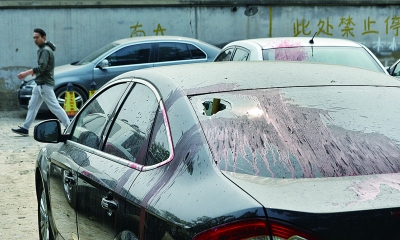 图为其中一辆私家车被泼上了油漆,车窗也被砸。摄/记者 郭谦