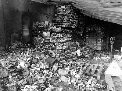 起火的大厅内仍然堆积着很多尚未烧毁的货物摄/实习记者 李东