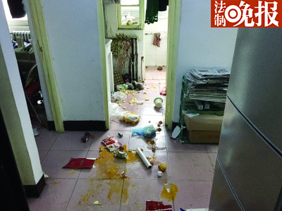 防盗门后的木门上还留有脚印,冰箱被打开,地面上有很多被打碎的食品,鸡蛋、水果、冰糖……不大的门厅被这些打碎的食品占得满满的。