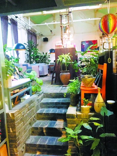 每个桌子与桌子之间都放了绿萝等盆栽绿植,轻轻的音乐声被风扇吹得更轻了,客人们也都自觉地低声交谈。咖啡馆里还有一个二层的小跃层,上面是榻榻米和软沙发,周围有特殊处理的帘子,拉上后大家互不相见,可惜上楼的话就要脱掉鞋子,有些麻烦。