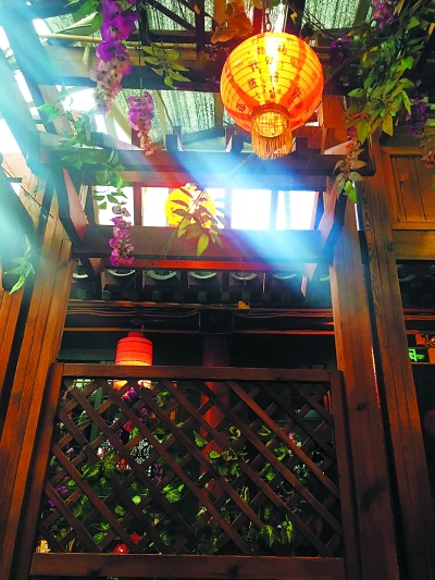 落座细看,整个餐厅就是一个四合院,原来的天井盖上了遮阳顶棚,用木格子巧妙分隔,再点缀以紫藤花架就成了散客大厅。东南西北各个屋子则变成了一个个雅间,细心的店家在窗户上还贴了红窗花。