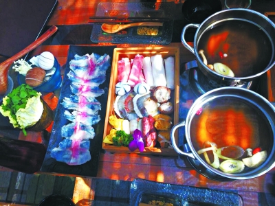 自助的酒精小火锅一人一锅,我的朋友到了以后,大姐麻利上锅,我们要的菌汤锅底,小料有两种,默认的是花生碎和辣椒胡椒碎双拼干碟,还有麻酱小料,但是都是调好的。我观察了一下,客人们要求上的最多的是斑鱼片,鱼片又大又薄,入锅片刻就熟,得赶紧捞出食用,否则吃起来有点老,但我觉得口味并不惊艳。除了羊肉肥牛、蔬菜菌类这类常见的涮肉用料,各种丸子是这里的特点,我偏爱芝士丸,香滑可口,其他的咖喱丸、海胆丸等我个人觉得口味一般。此外扇贝、蟹籽包、黑椒肠、蘑菇虾滑、饵块涮着吃也都不错。我们还单点了玫瑰水喝,酸酸甜甜的里面放着几朵小玫瑰花苞,60元一小扎,感觉性价比不高。 孟环文并摄J147