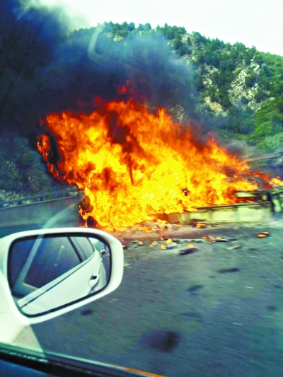 据目击者韩先生回忆,下午4点左右,他开车途经该路段时,发现前方车辆都停滞不前,甚至有的已经开始倒车,随后就看到了前方的一片浓烟。一辆货车停在路旁,冒着黑烟的是车上的货物,但因为烟太浓了,车上拉的什么已经看不出来。随后便是一声巨响,冒烟的卡车发生爆炸,第一声爆炸时,车上碎片四射,碎片飞起的高度已经超过了前方的隧道口。“后来又炸了几响,看情形特别危险,所有车辆都不敢贸然靠近,堵在后面的车越来越多了。”