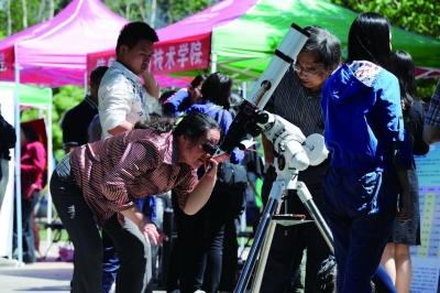 一名家长在天文系的摊位前观察望远镜摄/记者 林晖