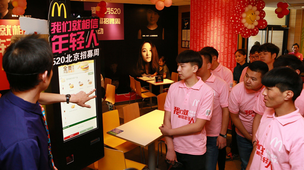 全国520招聘周北京麦当劳北洼路餐厅品牌偶像带领百人学生团学生体验应聘岗位。