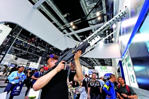 17日,参观者在体验展出的无人机拦截系统。当日,由公安部主办的第八届中国国际警用装备博览会在北京国家会议中心举行。本届警博会吸引了来自中国、俄罗斯、美国、法国、瑞士、以色列等多个国家和地区的506家参展商。 新华社发