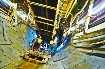 “我们用膨化土加水的方式改良土质,提高了盾构掘进速度。”管线项目技术部部长刘磊说,这一技术就好比给土质发酵,使砂土成为粘性性质,推进速度更快。