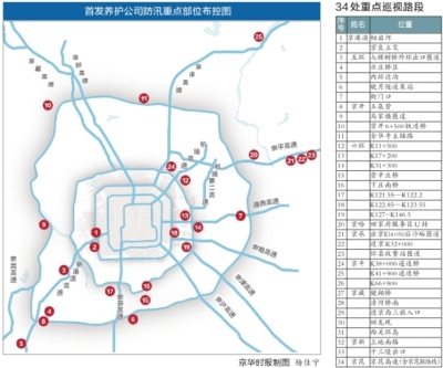 记者注意到,京藏高速容易积水点达到5处,包括健翔桥、清河桥南、进京西三旗入口、回龙观、西关环岛等。京开高速的玉泉营、马家楼匝道、金华寺主辅路等区域也属于易积水点。龙海峰表示,针对这25处积水点,首发养护公司将设置专门的职守及巡视人员,从启动蓝色预警开始到解除预警,职守人员要做到一直不离岗。同时,从开始下雨至雨停,车辆要不间断在道路上巡视。