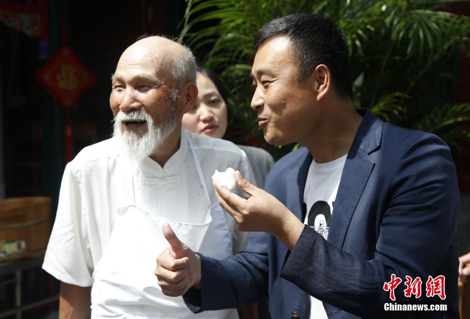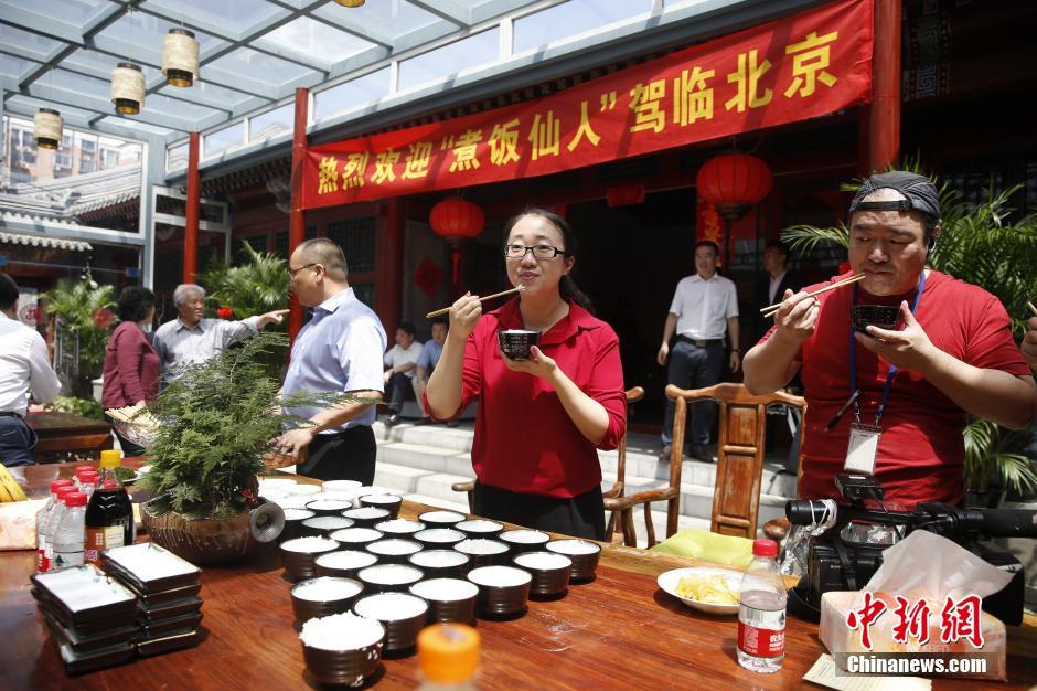 5月26日,被誉为“煮饭仙人”的日本85岁老人村嶋孟在北京一个四合院里展示技艺,图为中国观众试吃米饭。他将在北京常住三年,去东北等地寻找中国最好大米。4月26日,他关掉了在日本大阪经营了半世纪的“银饭屋下户亭”。中新社记者 张浩 摄