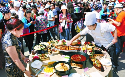 今天上午,延庆2016年乡村美食月开幕式在延庆永宁镇上磨村举行美食大赛,经过遴选的30家民俗户各自拿出看家本领一决高下,经过两小时的紧张厨艺展现,妫源鲟鱼锅、锅盔牛骨、海坨生态餐、河捞面等30桌色香味俱全的乡村美食新鲜出炉。本报记者 刘平摄
