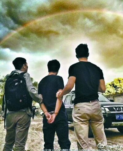 这几天北京市民在朋友圈中晒出的彩虹照中,一张走红的“彩虹抓捕图”别样出彩。雨后初晴的云空中一道靓丽彩虹的穹顶之下,是三名男子的背景,中间的一人双手背后戴着一副手铐。此图一出立即引得网友们一片盛赞。而抓捕嫌疑人的两个高大身影究竟是谁?这也引发众人猜测和热议。今天上午,本报记者见到了陈旭和蔺吉帅,这两位海淀公安分局刑警支队重案队的警官,就是照片中的两位主人公。