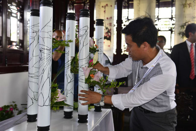 当地时间5月27日下午,在美丽的中国华园里,伴随着优美的古琴乐曲,插花艺术大师李海波身着一袭中式服装,以苏州古典园林为背景,运用百合、玫瑰等花材,演绎了题为《和谐画卷》的作品,象征着生机勃勃、多姿秀丽的生活状态,也诠释了北京世园会“绿色生活美丽家园”的主题。“另一幅作品取名《江山如画》,因为‘圆’在中国有代表天﹑和谐﹑圆满等含意,以圆型造型寓意中土两国在各个领域的协同发展,共创美好未来。”李海波介绍说。