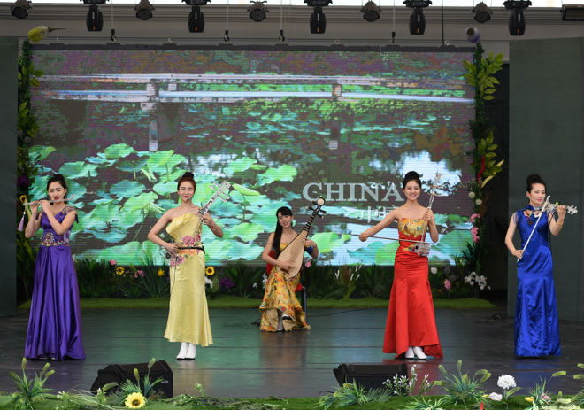 当日下午在小剧场举办的文艺表演也成为此次活动的一大亮点。国内著名新民乐团队女子水晶乐坊演奏的民乐《浣溪沙》、《花雨湖畔》、《丝路花雨》、《彩云追月》为中国华园增添一缕古典气息;经典民歌《茉莉花》吸引中外游客纷纷驻足欣赏;由金狮杂技艺术团表演的超高难度的杂技《俏花旦》、《高椅倒立》成为博人眼球的重头戏,其中《俏花旦》是国际杂技舞台同类节目中最具有代表性、最具知名度的节目之一,新颖巧妙的技巧设计,惊险高难的技艺令全场叹为观止。