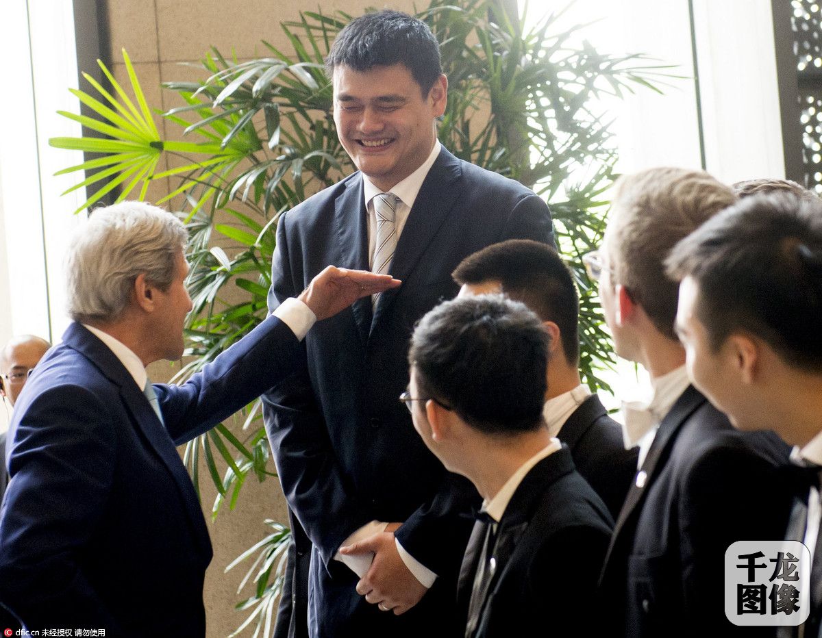 2016年6月7日,第八轮中美战略与经济对话和第七轮中美人文交流高层磋商6日在北京钓鱼台国宾馆开幕。7日,国务院副总理刘延东与美国国务卿克里会见中美球员,克里与姚明比起身高来。千龙网发(图文来源:东方IC )