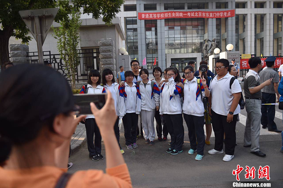 2016年6月8日,为期两天的2016年全国高考进入尾声,下午5时,全国940万考生陆续走出考场。图为北京东直门中学考场外合影的考生。 中新网记者 金硕 摄