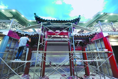 前门大栅栏商业街18号三庆园老戏楼重建施工现场,工人们正在雕梁画栋,重现古老戏院的风貌。
